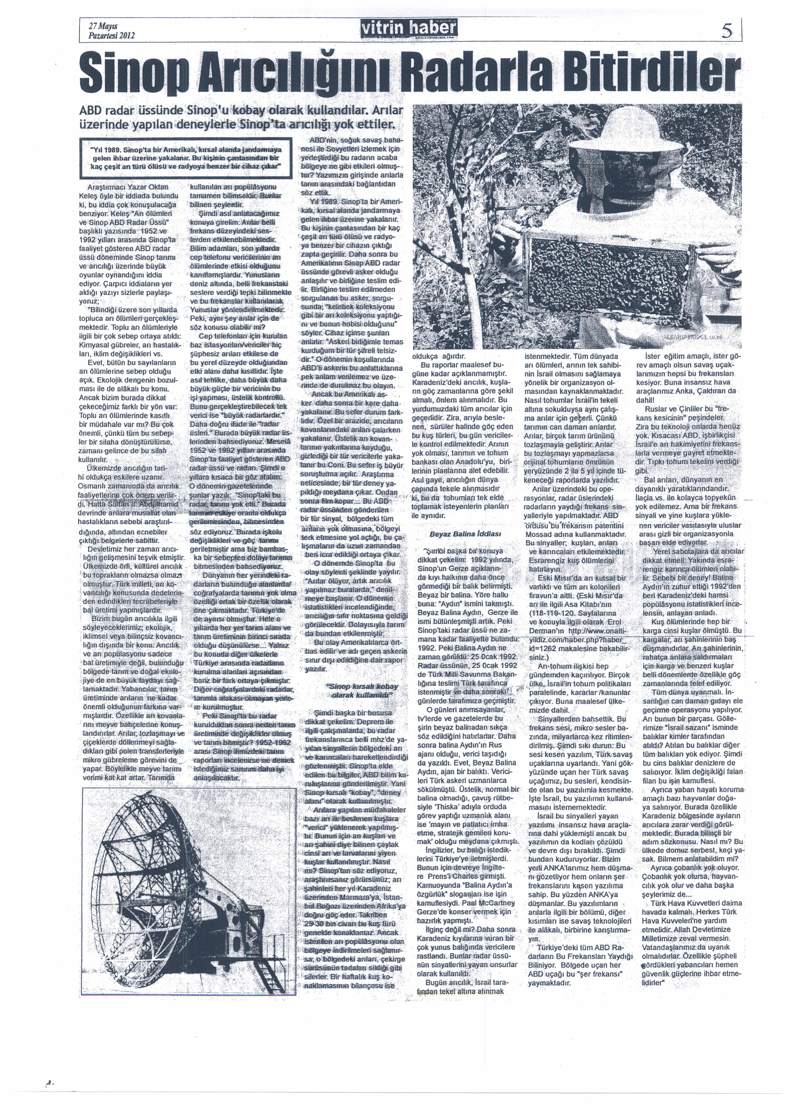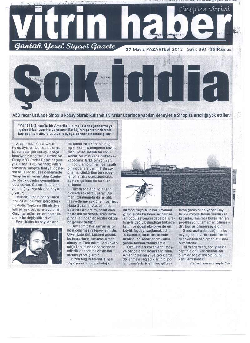 Haberimiz mahalli basında da yankı buldu: Oktan Keleş'in Türkiye ile ilgili çok önemli uyarılarda bulunduğu: "Arı Ölümleri ve Sinop ABD Radar Üssü"(http://www.onaltiyildiz.com/haber.php?haber_id=1555) makalesi Sinop'ta Mahalli basın tarafından manşetlere taşındı.